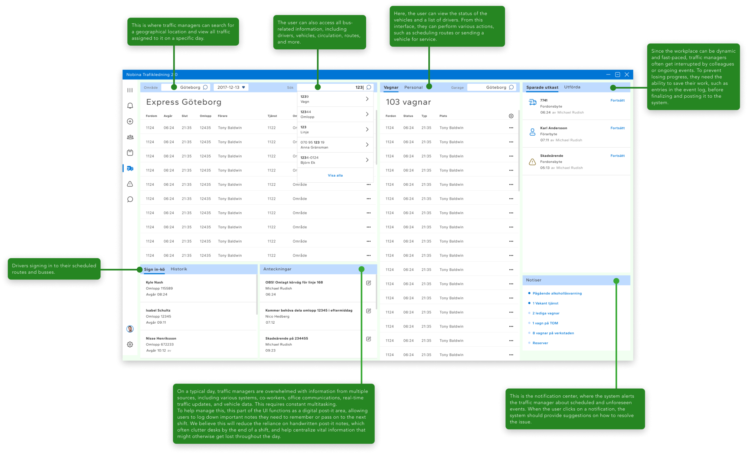 Nobina, Sweden's leading public transport operator, was modernizing its traffic management software. This upgrade will improve handling of unexpected events and incorporate emerging technologies to maintain market competitiveness.The current system manages multiple real-time operations, with operators working together to resolve traffic disruptions. Success requires deep understanding of both traffic dynamics and organizational processes due to complex system architecture, multiple contractual obligations, various operational dependencies. These factors make informed decision-making crucial for effective traffic management. For the new system and UX to meet these standars, Nobina hired Gean for the assignment of designing a better version.